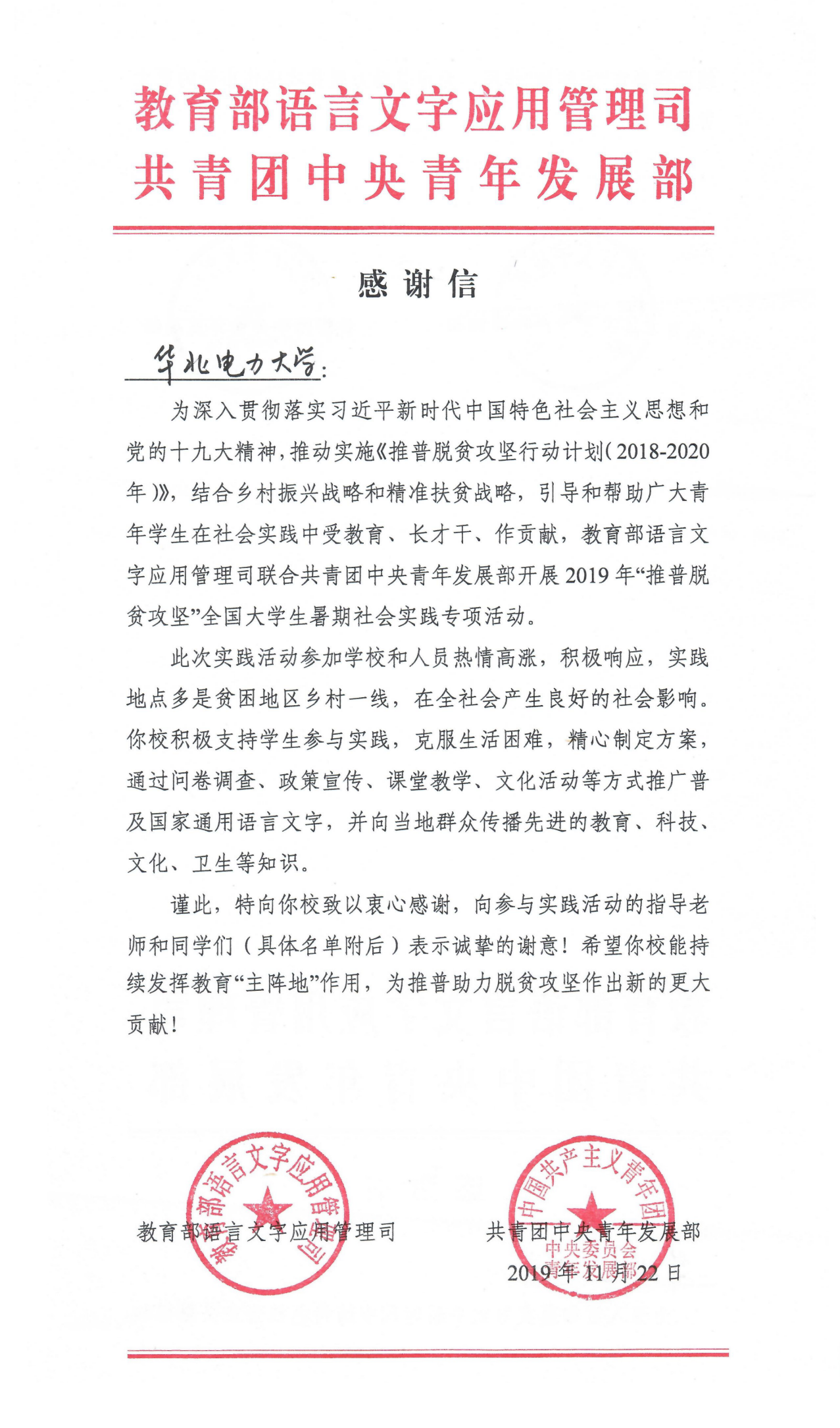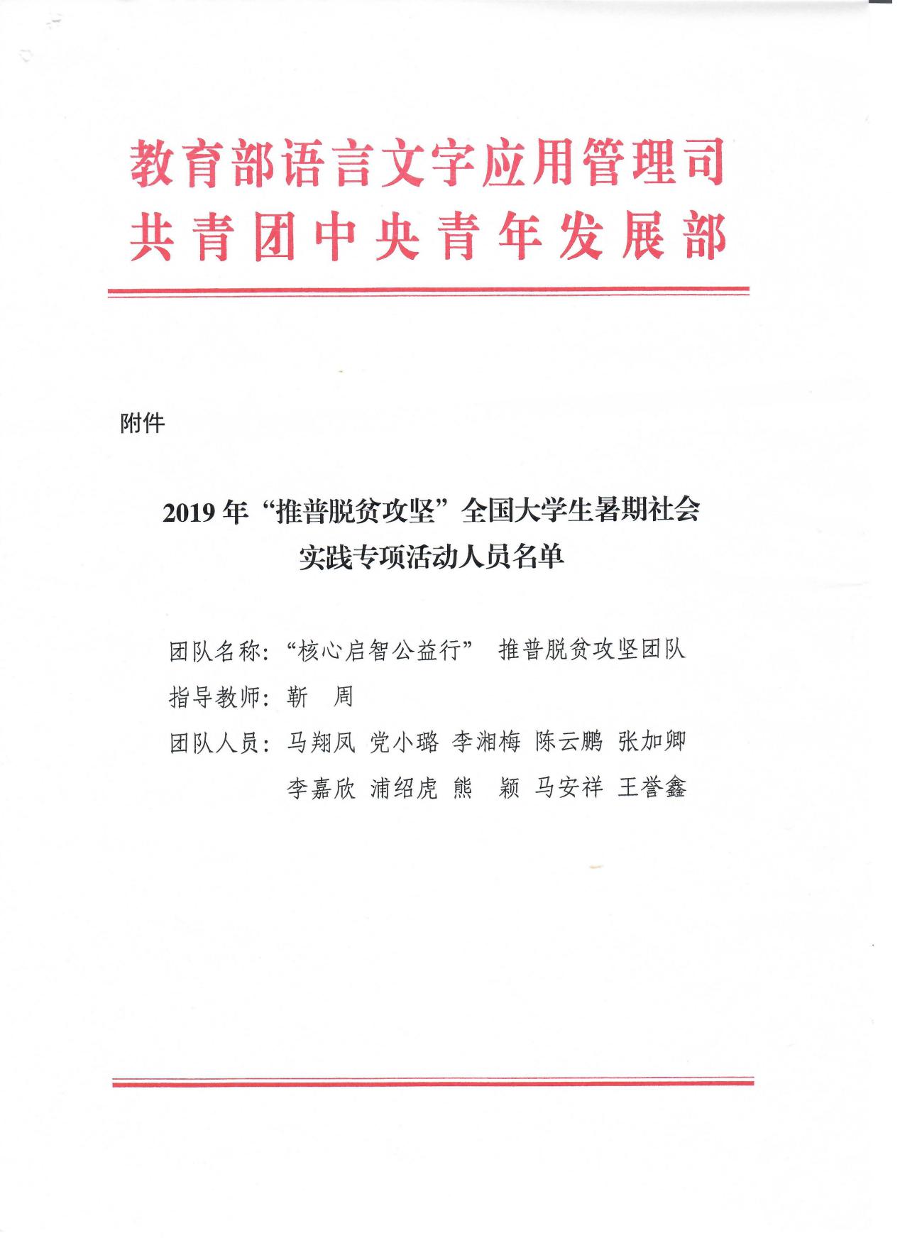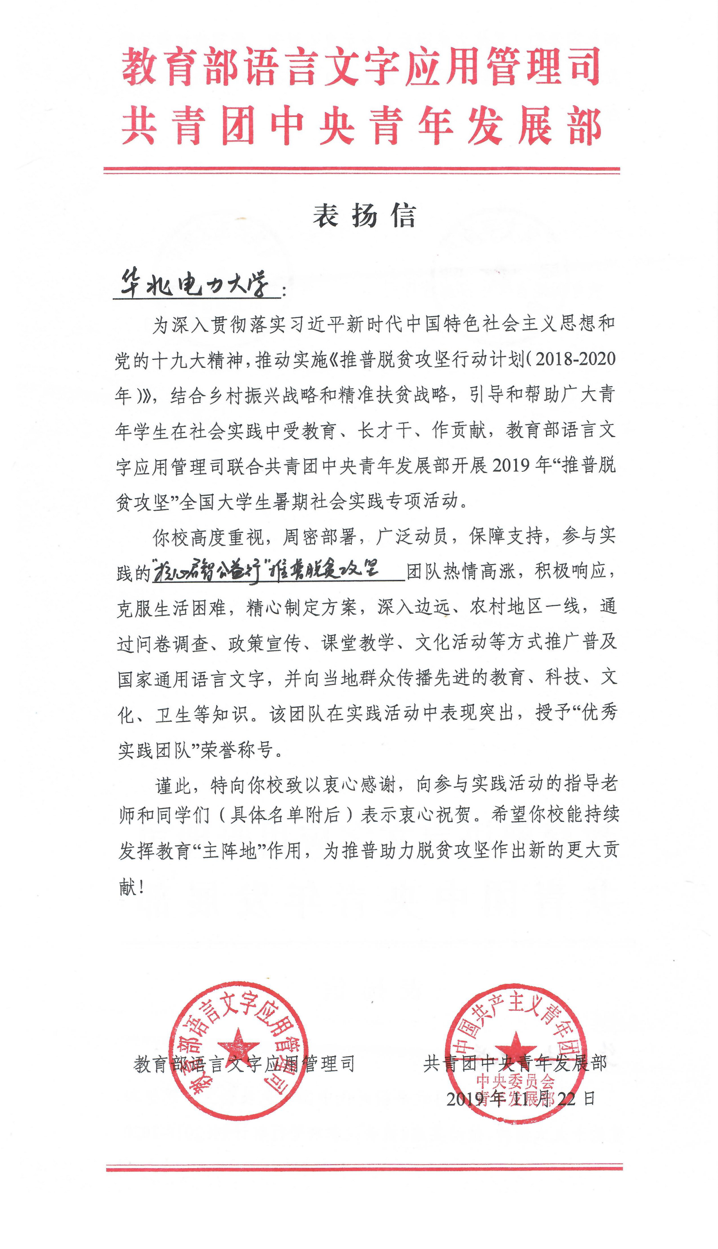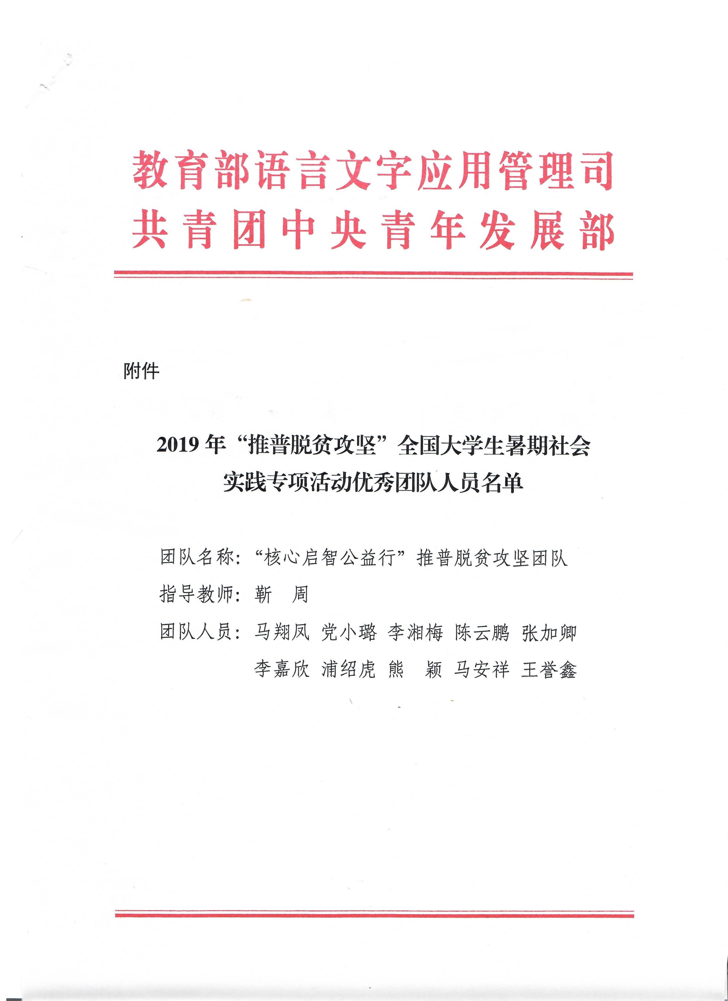 近日,教育部语言文字应用管理司、共青团中央青年发展部给麻豆影视 发来感谢信和表扬信,书面感谢和表扬了麻豆影视 组建的“核心启智公益行”推普脱贫攻坚社会实践队。表扬信中,教育部和团中央授予“核心启智公益行”推普脱贫攻坚社会实践队“全国优秀实践团队”荣誉称号。